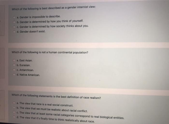 Which of the following statements is true of ethnicity. A-Displays a unique culture within the larger culture B-Are always of the same race C-Are of the same social class 2The concept of race is used to describe A- The ideological unity of a people B- The physical characteristics of a group C- The life chances a people have in common D- None of the above 3Which of the following best defines. There are more than a thousand languages spoken but only a few ethnic groups. Which of the following best describes organizational plurality. A community or population who share a common cultural experience or ancestry a. B It refers to cultural and sometimes physical characteristics used to classify people into groups or categories considered to be significantly different from others. Which of the following statements best describes diversity in sub-Saharan Africa. Which of the following statements best defines the techniques of management. It refers to a group of people who share a common religious background.
