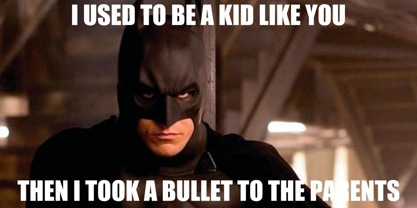 Uploaded by an Imgflip user 10 months ago. Have you laughed today. The best site to see rate and share funny memes. An edit made it even better. Thanks for watchingEnjoy-----0000 Batman 19890201 Batman Begins 20050328 Batman V Superman. Batmans Parents Action Figures is a two-pack set featuring Bats parents in facing down in their death position and bathed in their own blood after being murdered in the dark alley. Batmans dead parents Template also called. Follow me penguinzmemes on Instagram. Batman Slapping Robin also known as My Parents Are Dead is an exploitable image of the DC Comics superhero Batman slapping his protégé Robin in mid-conversation.